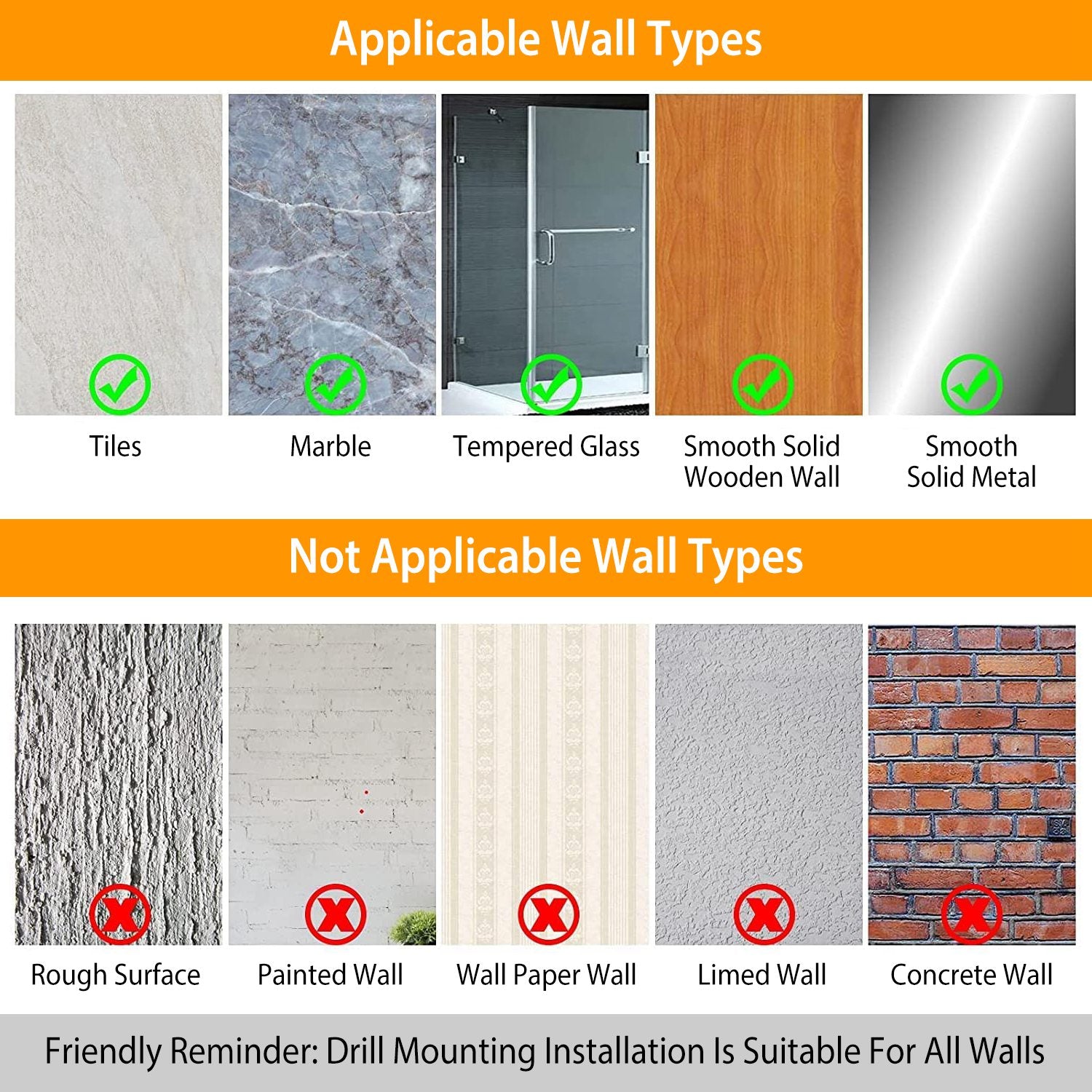 Kindly please be advised on “No Drilling Method”:a) ONLY stick shower caddy on smooth hard and flat surfaces. b) Please DON’T stick the shelf on painted walls or wallpapers as it will take off your paint or wallpapers.