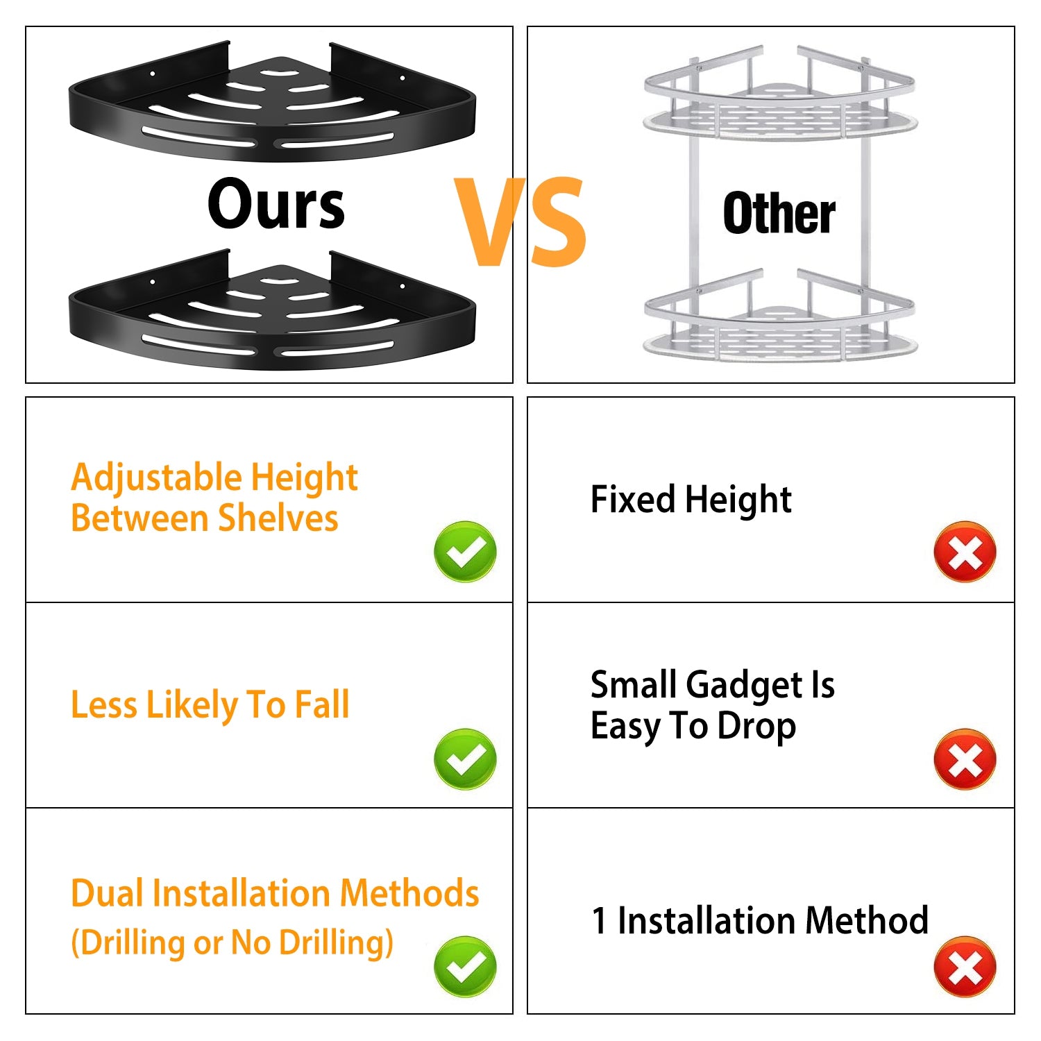 - **No Height Limitation*: Separate and independent dual tier shelf,you can mount one on your bathroom and install one to the kitchen,or combined to form a dual tier shower caddy shelf or dual tier kitchen seasoning holders,the height between them can be set by yourself.
